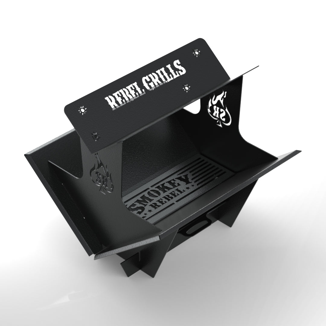 Dimensions: Size 70cm x 74cm x 77cm Cooking Area 62cm x 63cm Product Details - 4mm mild steel construction - Includes fire grate - Wide-format fire bowl with open sides - Compatible with Rebel cooking accessories - Finish: Gunmetal (develops a natural patina)