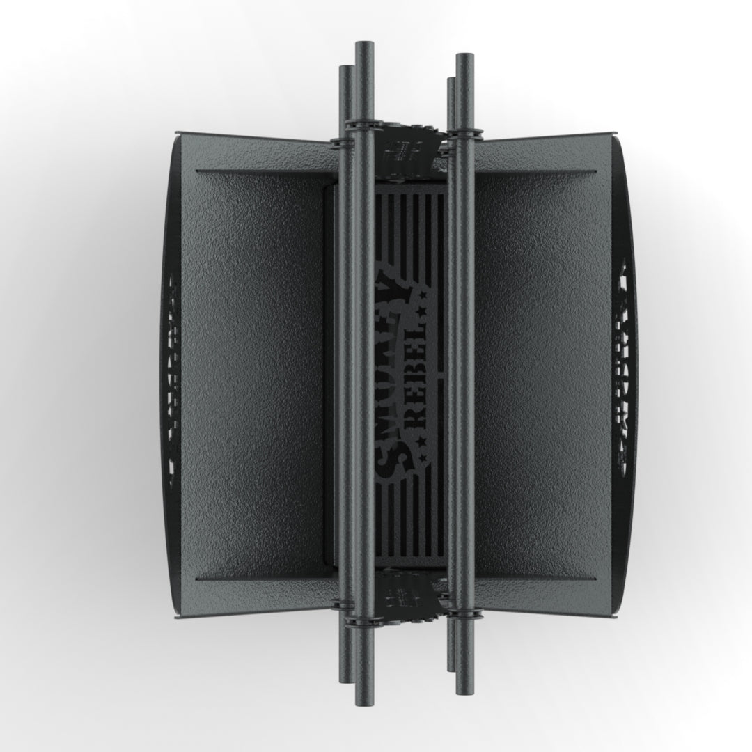 Dimensions: Size 118cm x 85cm x 71cm Cooking Area 63cm x 61.5cm Product Details - 4mm mild steel construction - Modular and upgrade-ready - Easy to clean, with open access to ash and burn area - Flat-pack storage (if disassembled) - Finish: Gunmetal (develops patina over time) Compatible with all Rebel cooking accessories